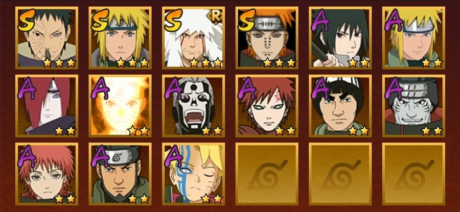 舞之豪傑自來也,水門,忍戰帶土,天道佩恩,九尾鳴人,須佐佐助,凱,阿斯瑪,青年水門,疾風傳我愛羅,青年長門,蠍,鬼鮫,死司飛段,桃式顯現博人