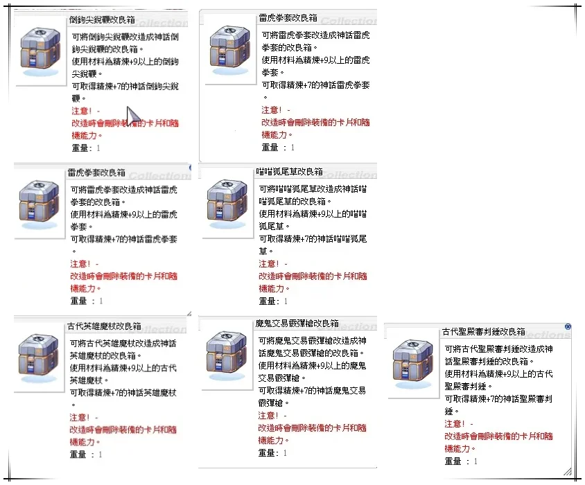 ---如圖,巴基利伺服器---此單為魔鬼交易改良箱= 50T另有古代英雄魔杖改良箱= 50T古代棘刺劍改良箱= 50T倒鉤尖銳鞭改良箱 = 50T喵喵弧尾草改良箱 = 100T賣場內另有許多便宜裝備歡迎參觀選購