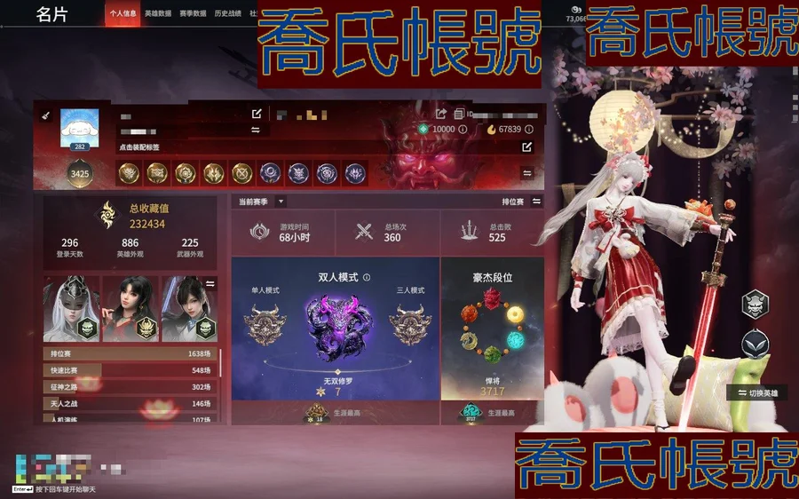 【OBYELEW272842】11紅388金丨等級282丨鉑金2丨金磚322丨幻絲379461丨通行證已升級Lv.87丨紅色神品:星輝魔紗,流金曉錦,帝星,蒼穹之光,龍雀,驚百里,少陽劍,狼主,沙漠香風,監兵凶神,初櫻綺夢發,變身器:洛天依·音愈律階,璃光·洛天依·共鳴,凱蒂貓·魔杖,荊魂,2674·初代機,千秋匠心·兇虎,角色金色皮膚:崑崙之主,開闢鴻蒙·山川潤,崑崙聖女,怪誕狂想·路奇迷蹤,魔傑·嘯天狼,追獵,倒反陰陽·凜冬,巔峰極速·蕾雅,瀚海蒼鷹,不良人·李星雲,長歌詩韻·鷓鴣天,遊四海,洛天依·星空投影,P5R·芳澤霞VIOLET,巔峰極速·小可,三麗鷗家族·凱蒂貓,怦然心動·軟暖甜夢,拳皇·雅典娜,青燈,長歌詩韻·遣唐使,新魔傑·辟邪帝姬,春日序曲·晨風,夏日派對·高校水著,山吹茶,承雲蘭壽,春桃笑,天鈿女命,御宅羅夢,主祭者,陰陽姬,清雅少女,貴胄少女,覺明尊者,冬日綺韻·白熊,八寶龍王,狩獵都市·暗夜利刃,決戰平安京·戀念私語,汐淚,楚韻九歌·湘夫人,赤霧煙霞,伏波龍女,倒反陰陽·鐵面,開闢鴻蒙·金戈止,2674·爭鬥洪流,弘毅袍,喜樂祥羽,祿運玉霄,寒煙素,姑射真人,麟鹿大鎧,九州遺珍·福壽仙,甜夜安眠·鵝黃紗夢,春日序曲·朝顏,開闢鴻蒙·風雨諧,鑄神·天祿瑞光,智繪·萍之緣,秋藏桂,P5R·奧村春NOIR,怦然心動·悅彩遊裳,絕倫袍,福瑞天澤,街頭狂歡·不敗擂主,西行劫·悟空,冬無歸,P5R·高卷杏PANTHER,熾火照夜,夏日派對·盛夏白陽,春不斂,喜緣紅線,楚韻九歌·雲中君,倒反陰陽·玄影,長歌詩韻·念奴嬌,雲間影,赤焰戰靈,古冢行,蝕日之輝,天虹詠,雪鈴綺歌,巫師3·特莉絲,長歌詩韻·如夢令,狩獵都市·雷行獵手,委蛇朱冠,競無間·女,紅絨暖·女,美團·團上頭了,紅絨暖·男,燼焚之尊,福虎帽,洛天依·資料耳機,凱蒂貓·蕾絲髮箍,巔峰極速·車隊帽,草莓貓耳,天冠,幻狸,貓咪尾巴,陰陽靈狐,冬日綺韻·熊熊頭,粽香遠,鮫人尾,倒反陰陽·鑑心冠,開闢鴻蒙·簪金纓,青龍盔,甜夜安眠·絨熊奶泡,淅蝶,魔燭帽,鑄神·靈瑞尾,P5R·NOIR的帽子,怦然心動·喵彩,綠野守護·絨絨貓,夏日派對·兔兔髮箍,希希,怦然心動·喵尾,虎絨耳,毛氈笠,_P5R·PANTHER面具,觀山海·冬稜,纖蝶絨輕,絨喜狐耳,季中賽2025·瀚沙,虹貓藍兔七俠傳·虹光,安樂冠,玉蓮冠,金瑛冠,苦痛荊冠,羽之鋒,鹿鈴角,神愈之冕,虹貓藍兔七俠傳·寒月,百戲碗,狩獵都市·碎空龍尾,驟雷鏢旗,髮型金色皮膚:(挑染)鳳姿發,逆水寒·江海發,(挑染)櫻舞發,木棉發,長歌詩韻·星橋發,(挑染)自在發,倒反陰陽·銘誓發,鑄神·降香發,楚韻九歌·爛漫發,綠野守護·嬌憨發,秀逸發,長歌詩韻·豪傑發,(挑染)風吹雪發,巫師3·王室顧問發,蜜語發,長歌詩韻·沉醉發,狩獵都市·迅猛發,長歌詩韻·五方獅,毒刺,武器金色皮膚:驚火弦,御氣弩,穿雲燕,朱雀,青鳥,沉默審判,戲祥雲,石中火,天心玉,雪國禮炮,雲朵咩咩,鶴逐霞,丹鶴,赤霞,心魔,腥紅之月,不良人·龍泉劍,琴心,赤霄,冷香,華夏神兵·永樂寶劍,含光承影,殘陽,拂雪絨,毅魂守,碎星河,錦鯉化龍·落櫻,數珠丸,斬銀河,塑夢鑰匙,聽濤,陰陽師·赤影妖刀,光威之矛,鎮山河,映紅鋒,長虹,建木,梅花簪,判官筆,仙舞,傲骨,嘶風,詭月·鏈魂,朧夜狐影,寶月琉璃,糖果棍,幽冥吟,2674·貳型電漿杖,觀山海·朱明,千鈞羽,斷月影,劫濤·潮,赤影玄印,銜月,青峰疊扇,墨絨羽扇,騰雲歌,櫻落,優曇華,倒反陰陽·盡春鋒,雷厲,詭刃八岐,醒獅,不良人·華陽針,玄銅飛軍,翠影,醉花風,, 【Steam】【國服】