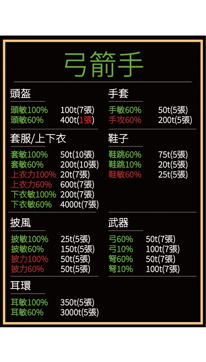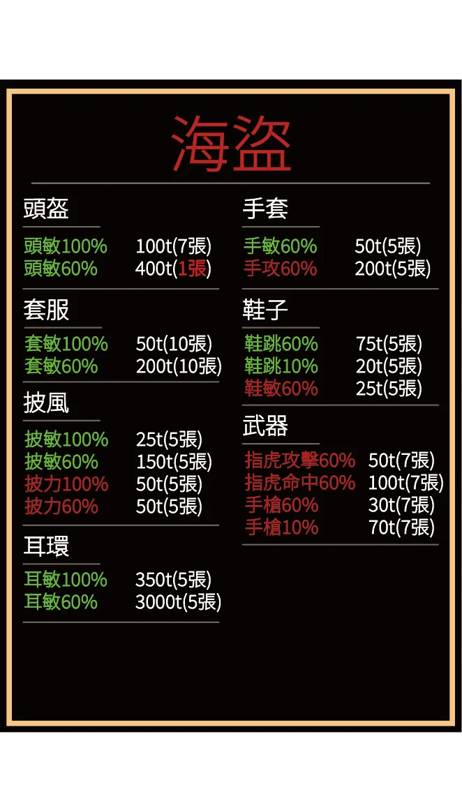 頭盔體力10%=5/張 (50張以上=3t/張)