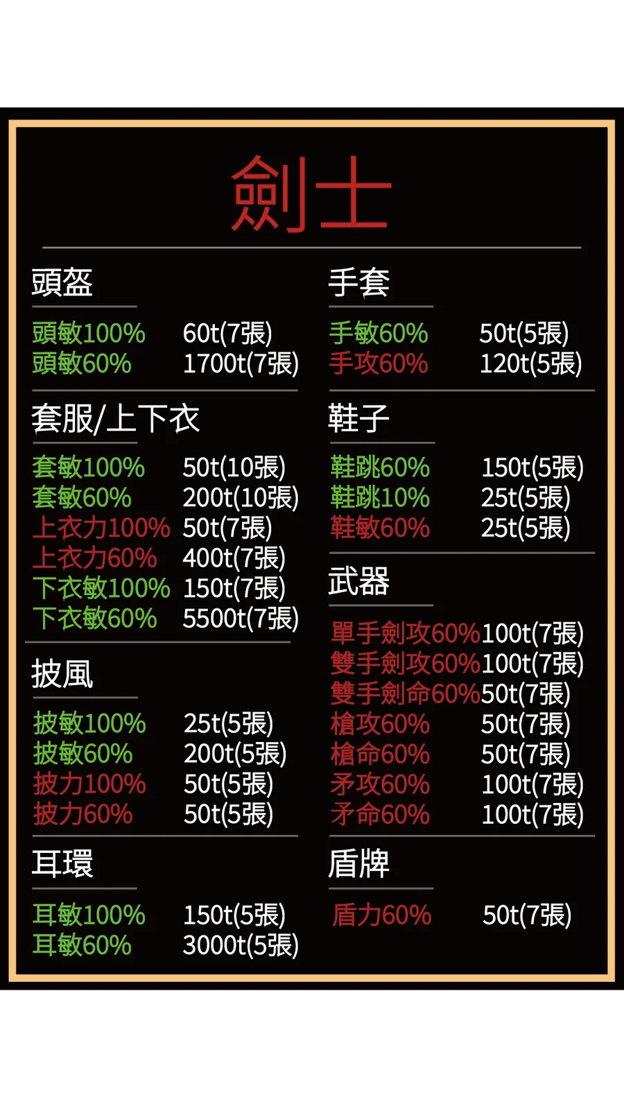 優惠組合餐B(劍士用):頭敏100%+上衣力100%+下衣敏100%=250t