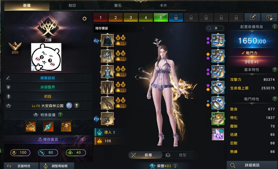 武器強化:25 手套強化:21 頭飾強化:21 肩胛強化:21 上裝強化:20 下裝強化:20