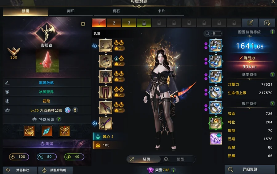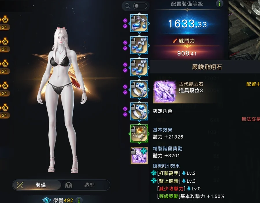 武器強化:22 手套強化:21 頭飾強化:21 肩胛強化:21 上裝強化:21 下裝強化:20