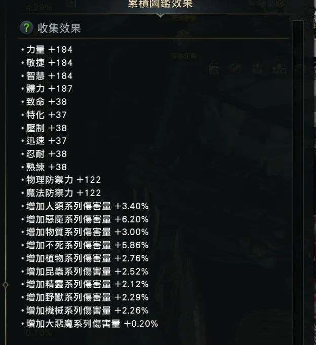 武器強化:25 手套強化:25 頭飾強化:25 肩胛強化:25 上裝強化:25 下裝強化:25