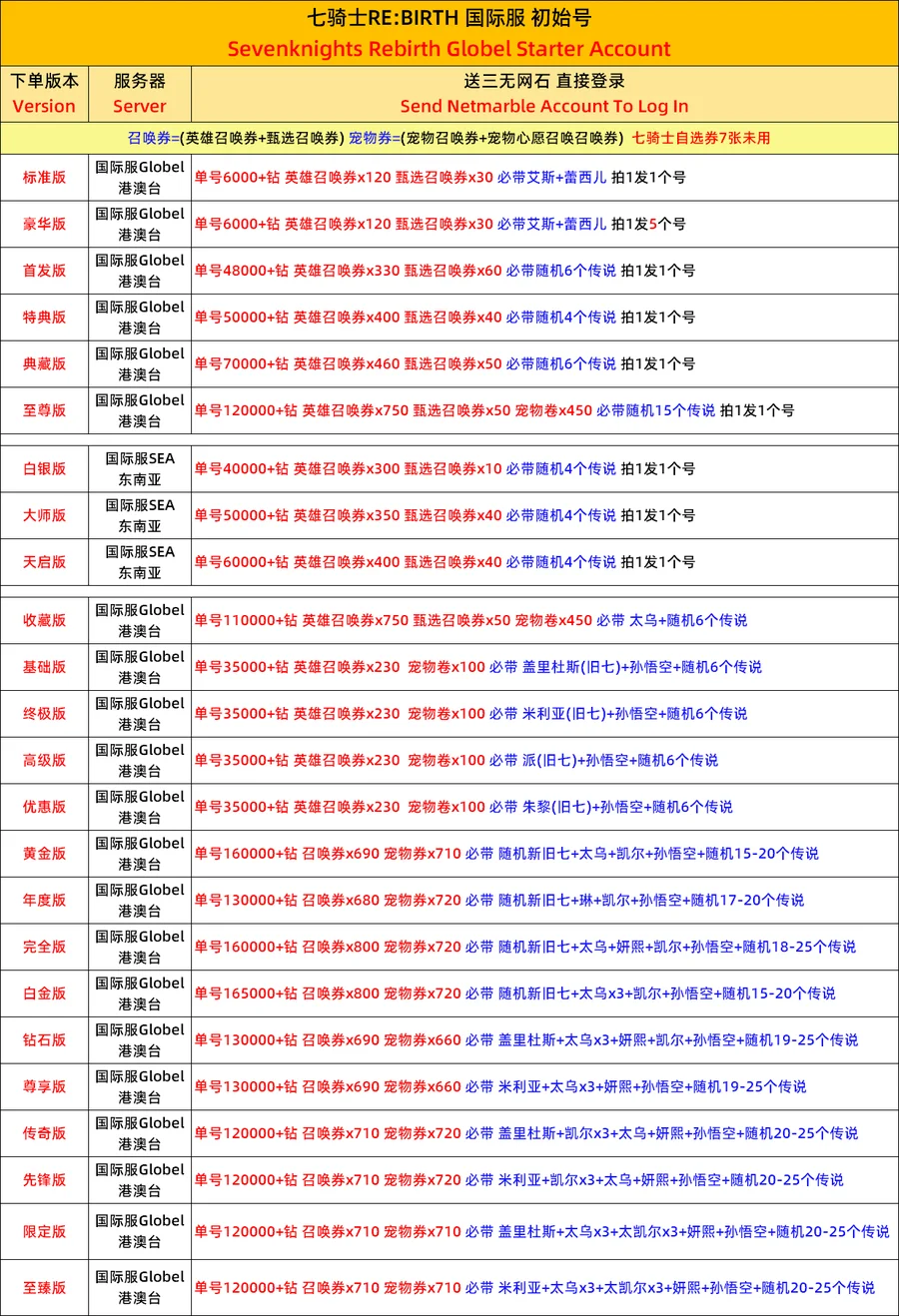 全 8591 首家 七騎士重生製版RE:BIRTH韓服國際服開局初始自抽自選初始首抽號