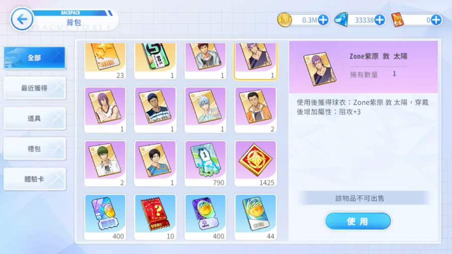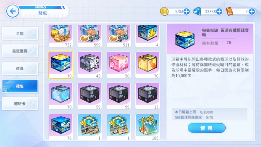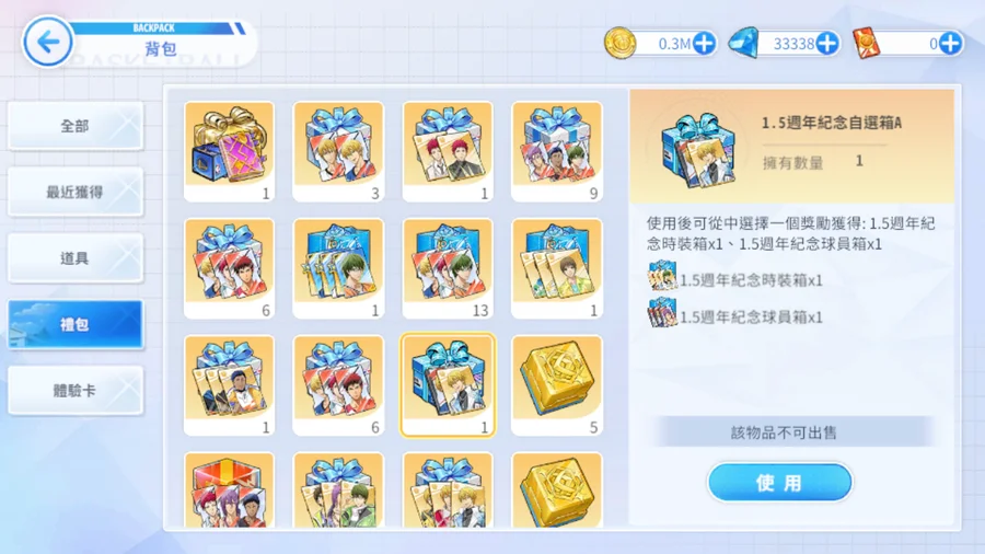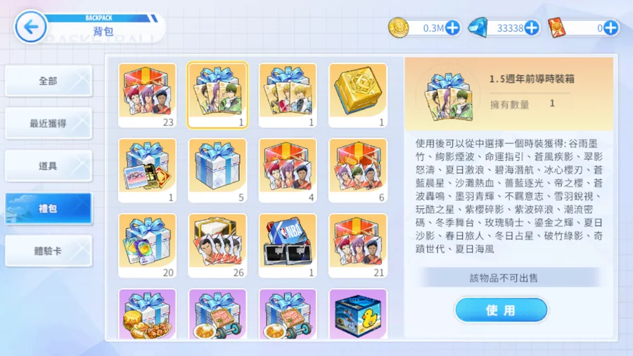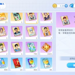 (十)黃瀨時裝自選箱、巔峰與奇蹟覺醒自選箱、青峰時裝自選箱、赤司時裝自選箱、夏日沙灘主題時裝、1.5週年紀念自選箱A、1.5週年前導時裝箱