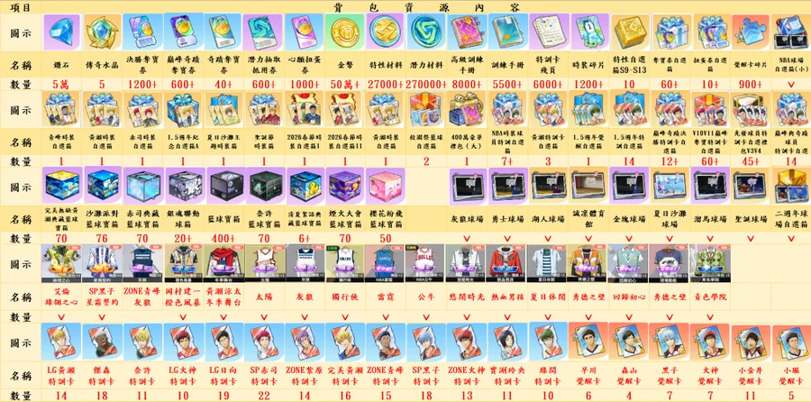 (八)NBA自選球場包、金塊球場、湖人球場、夏日沙灘球場、誠凜體育館、勇士球場、聖誕節球場、二週年球場自選箱、灰狼球場、