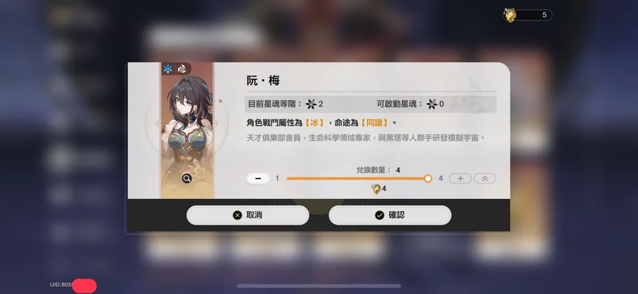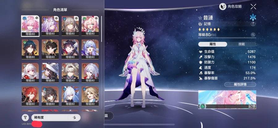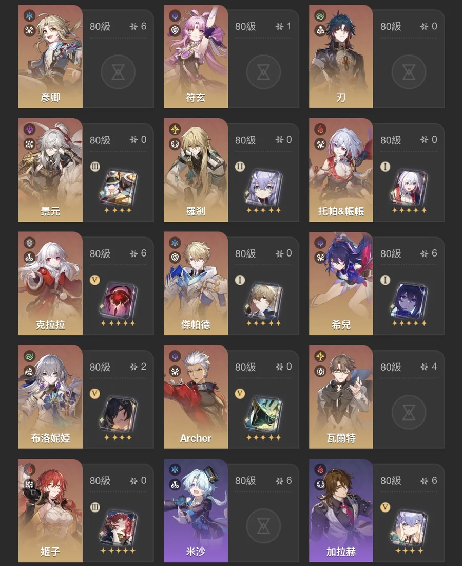 滿命五星 : 風堇 / 昔漣 / 海瑟音 / 遐蝶 / 黃泉 / 流螢 / 知更鳥 / 卡芙卡 / 黑天鵝 / 希兒 / 克拉拉 / 彥卿 / 阮梅(目前2命可換滿)