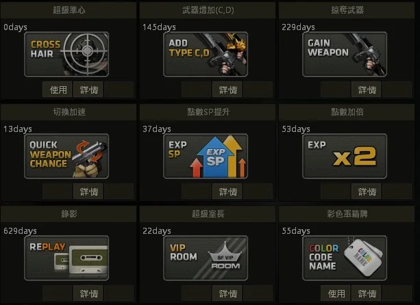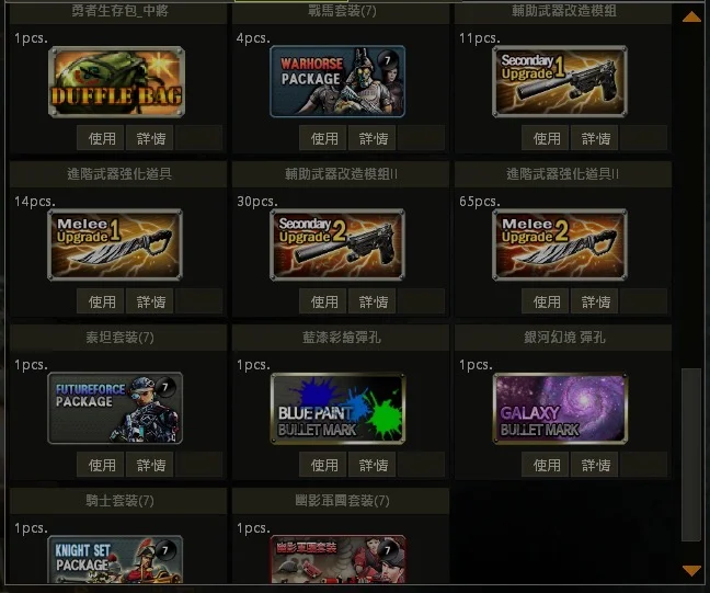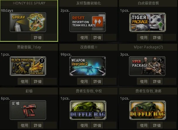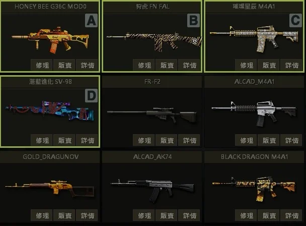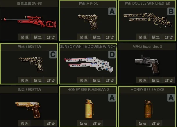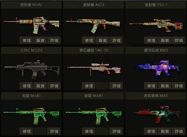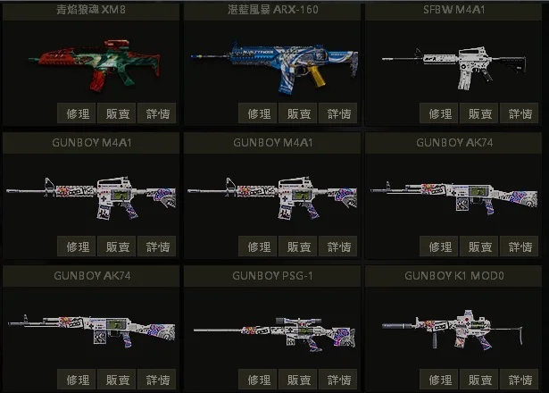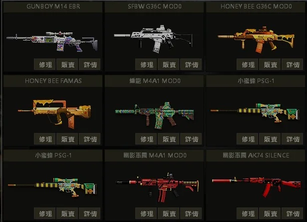 新增:榮耀小貝.團結UZI.堅信AK.奇蹟M4.伊邪SV.天照M.過去之烏M.豬豬不求人.釘槍.狩虎刀.鯖魚XM8