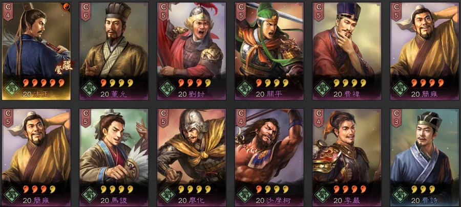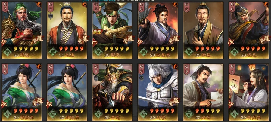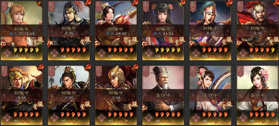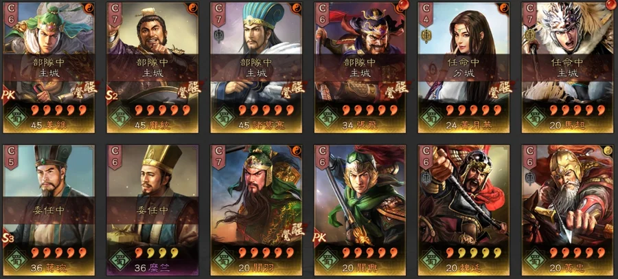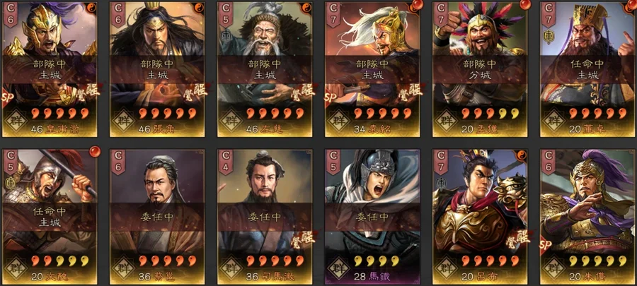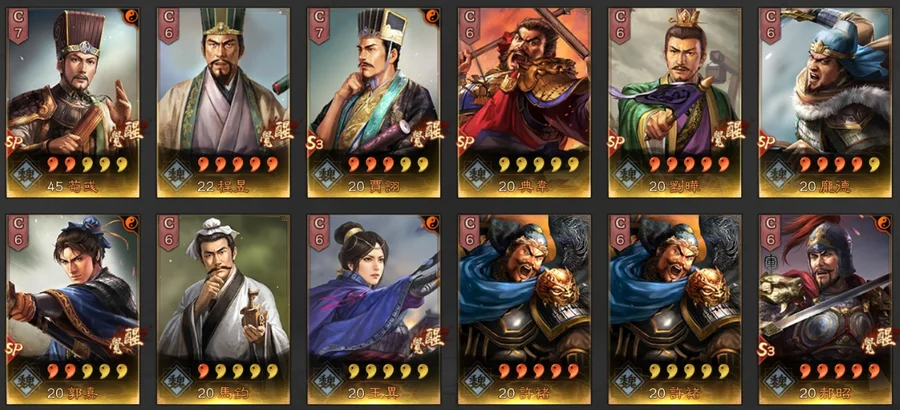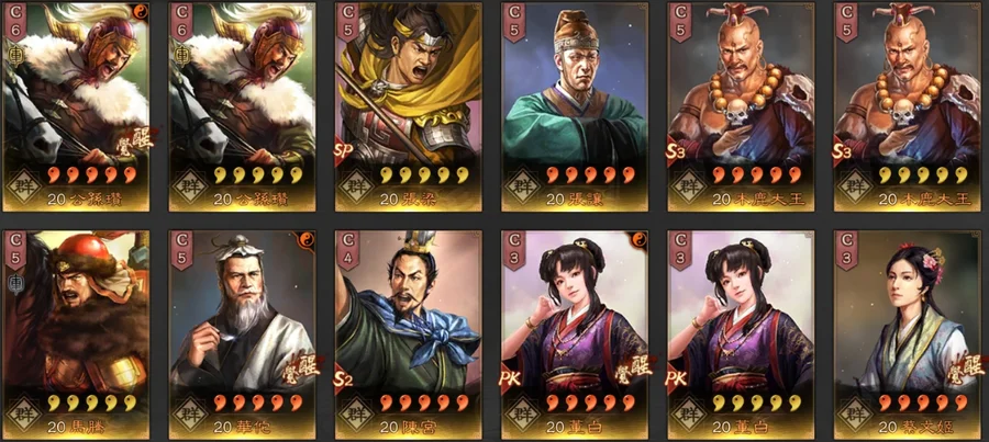 典藏:姜維 孫尚香 凌統 董卓 呂布 張飛 司馬懿 張遼 馬超 黃月英 曹操 關羽 朱儁 SP袁紹 孟獲 夏侯惇 魏延 黃忠 甘寧 太史慈 孫堅 呂玲綺 滿寵 鄧艾 諸葛恪 貂蟬 SP皇甫嵩 關興 呂蒙 龐德 張春華