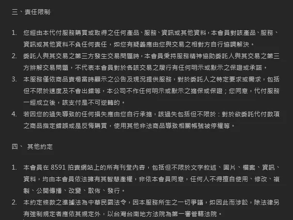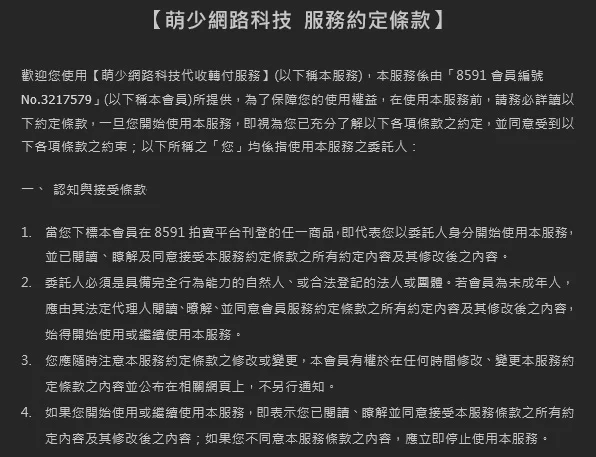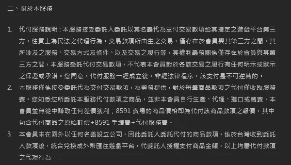 1. 請您悉知,本代儲純粹提供代收付服務並收取勞務費用(商品代收總額(即8591下單售價)=您委託代付的商品外匯價格(即商品成本)+手續費+每項代付服務費50元),如下標即表示您已瞭解且同意服務約定條款及下列幾點所述之內容。