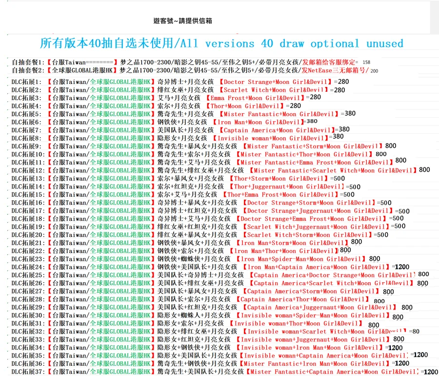 | 套餐4 | 必帶三星【奇異博士+5-8個角色】 | 700 | |