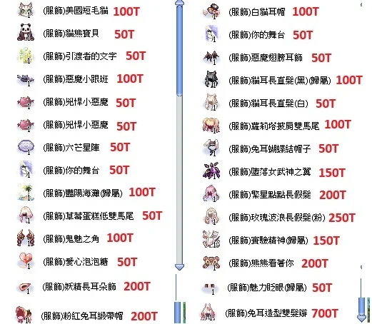 50T系列:熊貓寶貝、引渡者的文字、兇悍小惡魔、六芒星陣、你的舞台、草莓蛋糕雙馬尾、愛心泡泡糖、惡魔翅膀耳飾(已售出)、貓耳長直髮(白)、兔耳蝴蝶結帽子、魅力眨眼、沒牙腳印披肩特效(沒牙or彈跳)