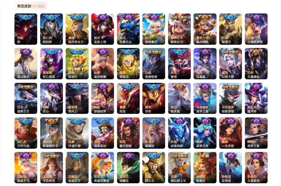 【限定皮肤131】 海诺心动手记 金蝉唐三藏 云中君群星魔术团 上官婉儿群星魔术团 墨子黄金天蝎座 刘邦剑破天穹 狄仁杰神器狴犴令 孙膑寅虎展翼 沈梦溪龙舞盛年 亚连落雪白狼 嫦娥如梦令 貂蝉曦玄引 艾琳觅芳踪 芈月白晶晶 大乔乘龙忆丹青 安琪拉乘龙聚宝船 曹操夜都魔契 孙尚香乘龙问璇玑 孙策乘龙淬吴钩 赵云乘龙铭钟鼎 姬小满妄想食味 鬼谷子天穹祈灯 牛魔奔雷神使 周瑜雪夜绮愿 蒙犽百解令 雅典娜黎明之约 司空震地狱燃心 西施至美乘鲤谣 阿古朵江河有灵 赵怀真鹤归松栖 张良古海寻踪 艾琳流音漫舞 戈娅驭风魔法 西施玲珑珍味 鲁班大师探海日志 裴擒虎擒涛扼浪 桑启海盐诗旅 梦奇顽趣 元歌无心 鬼谷子五谷丰年 李元芳云中旅人 狂铁电玩高手 王昭君午后时光 沈梦溪大漠名商 明世隐吟游魔法 白起夜都怪侠 兰陵王金庭之子 百里玄策原初追逐者 黄忠火炮绅士 鲁班七号寅虎瑞焰 艾琳女武神 芈月幻夜卜梦 达摩沙漠行僧 嫦娥拒霜思 干将莫邪真爱魔法 后羿圣弓游侠 庄周高山流水 猪八戒猪悟能 苏烈千军破阵 狄仁杰万华元夜 亚瑟潮玩骑士王 虞姬启明星使 孙悟空零号赤焰 云中君纤云弄巧 蒙犽狂想玩偶喵 雅典娜单词大作战 裴擒虎李小龙 鬼谷子原初探秘者 猪八戒西部大镖客 马可波罗暗影游猎 老夫子醍醐杖 公孙离蜜橘之夏 赵云引擎之心 百里守约朱雀志 百里玄策白虎志 花木兰瑞麟志 李白凤求凰 诸葛亮武陵仙君 吕布天魔缭乱 杨戬永曜之星 孙悟空大圣娶亲 露娜一生所爱 明世隐疑决卦 钟馗神迹守卫 关羽冰锋战神 甄姬游园惊梦 庄周云端筑梦师 王昭君凤凰于飞 杨玉环遇见飞天 米莱狄御霄 上官婉儿梁祝 孙膑妖精王 妲己热情桑巴 盾山御銮 虞姬霸王别姬 鲁班七号狮舞东方 狄仁杰魔术师 庄周蜃楼王 赵云皇家上将 芈月重明 李元芳银河之约 貂蝉逐梦之音 典韦穷奇 项羽霸王别姬 亚瑟狮心王 曹操烛龙 项羽海滩派对 狄仁杰阴阳师 吕布猎兽之王 虞姬凯尔特女王 孙悟空美猴王 马可波罗逐梦之星 苏烈玄武志 哪吒逐梦之翼 干将莫邪冰霜恋舞曲 蔡文姬奇迹圣诞 东皇太一逐梦之光 铠青龙志 白起狰 沈梦溪星空之诺 韩信逐梦之影 蔡文姬繁星吟游 扁鹊炼金王 高渐离死亡摇滚 孙悟空至尊宝 狂铁御狮 后羿辉光之辰 太乙真人饕餮 花木兰青春决赛季 弈星混沌棋 夏侯惇朔风刀