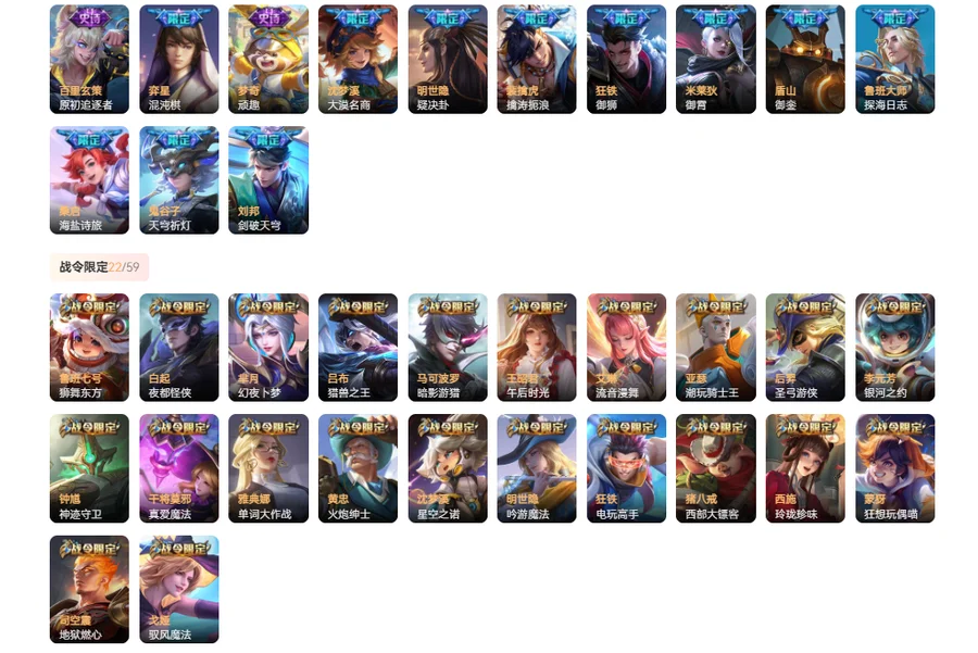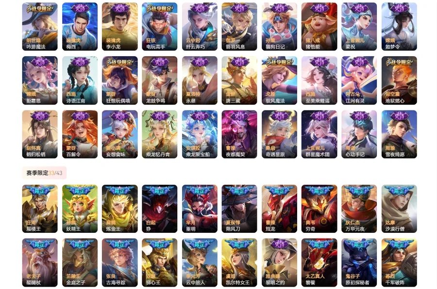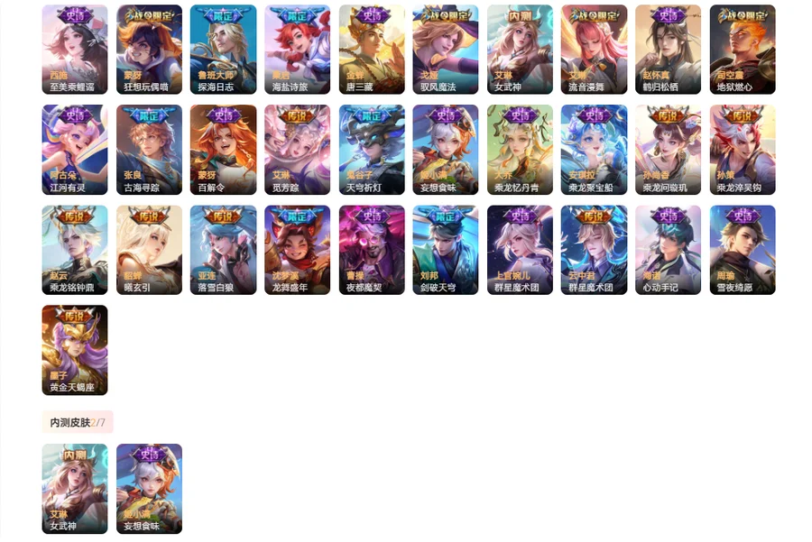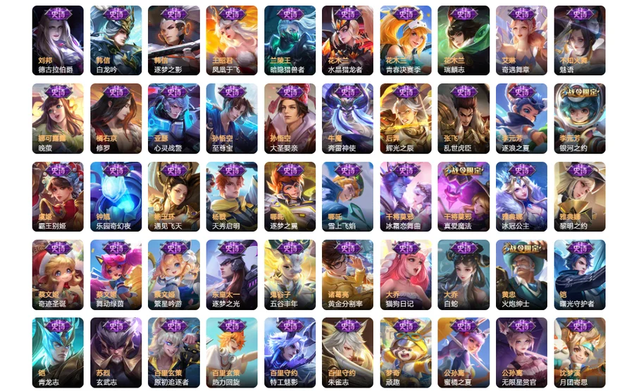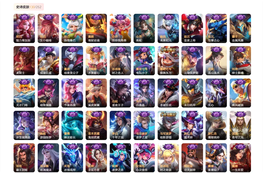 【史诗皮肤130】 海诺心动手记 金蝉唐三藏 上官婉儿群星魔术团 桑启奇遇星旅 孙膑寅虎展翼 鲁班七号电玩小子 嫦娥如梦令 芈月白晶晶 大乔乘龙忆丹青 安琪拉乘龙聚宝船 曹操夜都魔契 姬小满妄想食味 墨子龙骑士 安琪拉时之奇旅 艾琳奇遇舞章 哪吒雪上飞焰 夏洛特永昼 牛魔奔雷神使 周瑜雪夜绮愿 蒙犽百解令 钟馗乐园奇幻夜 大乔白蛇 公孙离无限星赏官 雅典娜黎明之约 嬴政暗夜贵公子 阿轲暗夜猫娘 不知火舞魅语 司空震地狱燃心 西施至美乘鲤谣 阿古朵江河有灵 项羽苍穹之光 赵怀真鹤归松栖 程咬金功夫厨神 沈梦溪月团寄思 橘右京修罗 娜可露露晚萤 百里玄策热力回旋 伽罗箭羽风息 蒙犽龙鼓争鸣 小乔青蛇 白起星夜王子 杨戬天秀启明 西施诗语江南 司马懿暗渊魔法 孙尚香时之恋人 曹操幽灵船长 戈娅驭风魔法 梦奇顽趣 元歌无心 鬼谷子五谷丰年 妲己女仆咖啡 赵云未来纪元 嬴政摇滚巨星 狂铁电玩高手 明世隐吟游魔法 宫本武藏鬼剑武藏 百里玄策原初追逐者 黄忠火炮绅士 刘禅绅士熊喵 亚瑟心灵战警 嫦娥拒霜思 廉颇地狱岩魂 干将莫邪真爱魔法 墨子金属风暴 庄周高山流水 猪八戒猪悟能 孙尚香水果甜心 云中君纤云弄巧 蒙犽狂想玩偶喵 甄姬冰雪圆舞曲 裴擒虎李小龙 马可波罗暗影游猎 公孙离蜜橘之夏 赵云引擎之心 百里守约朱雀志 兰陵王暗隐猎兽者 李元芳逐浪之夏 阿轲节奏热浪 百里守约特工魅影 吕布末日机甲 诸葛亮黄金分割率 花木兰瑞麟志 韩信白龙吟 孙悟空大圣娶亲 花木兰水晶猎龙者 露娜一生所爱 关羽冰锋战神 甄姬游园惊梦 庄周云端筑梦师 王昭君凤凰于飞 杨玉环遇见飞天 雅典娜冰冠公主 上官婉儿梁祝 妲己热情桑巴 狄仁杰鹰眼统帅 虞姬霸王别姬 鲁班七号狮舞东方 狄仁杰魔术师 妲己魅力维加斯 赵云皇家上将 李元芳银河之约 貂蝉逐梦之音 项羽霸王别姬 马可波罗逐梦之星 孙策猫狗日记 苏烈玄武志 安琪拉心灵骇客 大乔猫狗日记 哪吒逐梦之翼 干将莫邪冰霜恋舞曲 刘禅天才门将 裴擒虎梅西 小乔缤纷独角兽 蔡文姬奇迹圣诞 蔡文姬舞动绿茵 东皇太一逐梦之光 铠曙光守护者 铠青龙志 夏侯惇乘风破浪 韩信逐梦之影 蔡文姬繁星吟游 张飞乱世虎臣 孙悟空至尊宝 后羿辉光之辰 花木兰青春决赛季 刘邦德古拉伯爵 露娜紫霞仙子 貂蝉圣诞恋歌 李白千年之狐 吕布圣诞狂欢