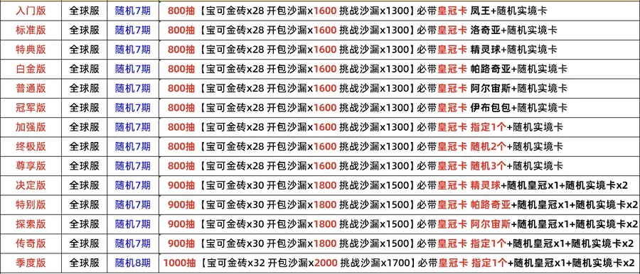 尊贵版 | 310 | 1572抽 | 【37宝可金砖+3300开包沙漏+2000挑战沙漏+随机双皇冠卡】 |