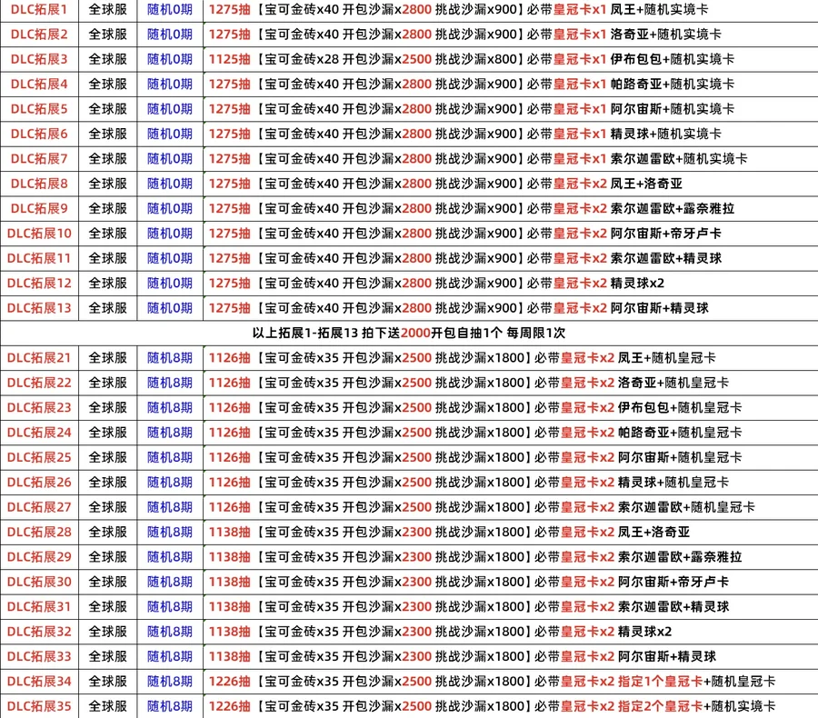 拓展23 | 400 | 2250综合沙漏=24宝可金砖+1000开包沙漏+1200挑战沙漏【自选以上 皇冠卡3个+实境卡1个】 |