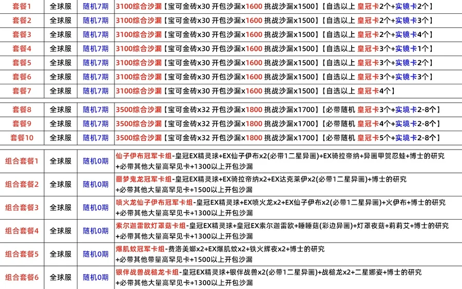 套餐1 | 700 | 仙子伊布冠军卡组-皇冠EX精灵球+EX仙子伊布×2(必带1二星异画)+EX骑拉帝纳+异画甲贺忍蛙+博士的研究+其它大量高罕卡/泛用卡+1300以上开包沙漏 |