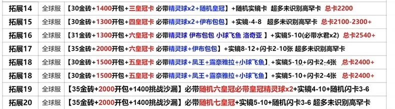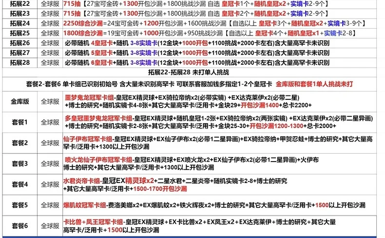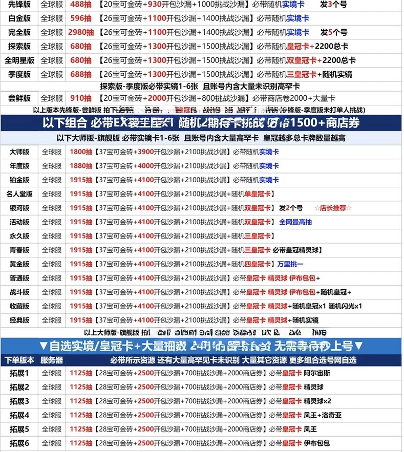 拓展29 | 950 | 全球服 必带随机 6皇冠卡+随机3-8实境卡(12金块+随机开包+1100挑战+2000卡左右)含大量高罕卡未识别 |