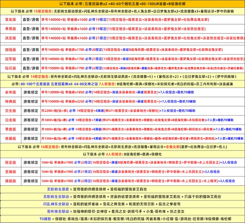 特典版 | 2500 | 单号150000+钻 单抽券x2250必带(14限定组合+满破泳装泰瑞丝+满破暗黑圣女+)+7人权组合+随机T0辅助 |