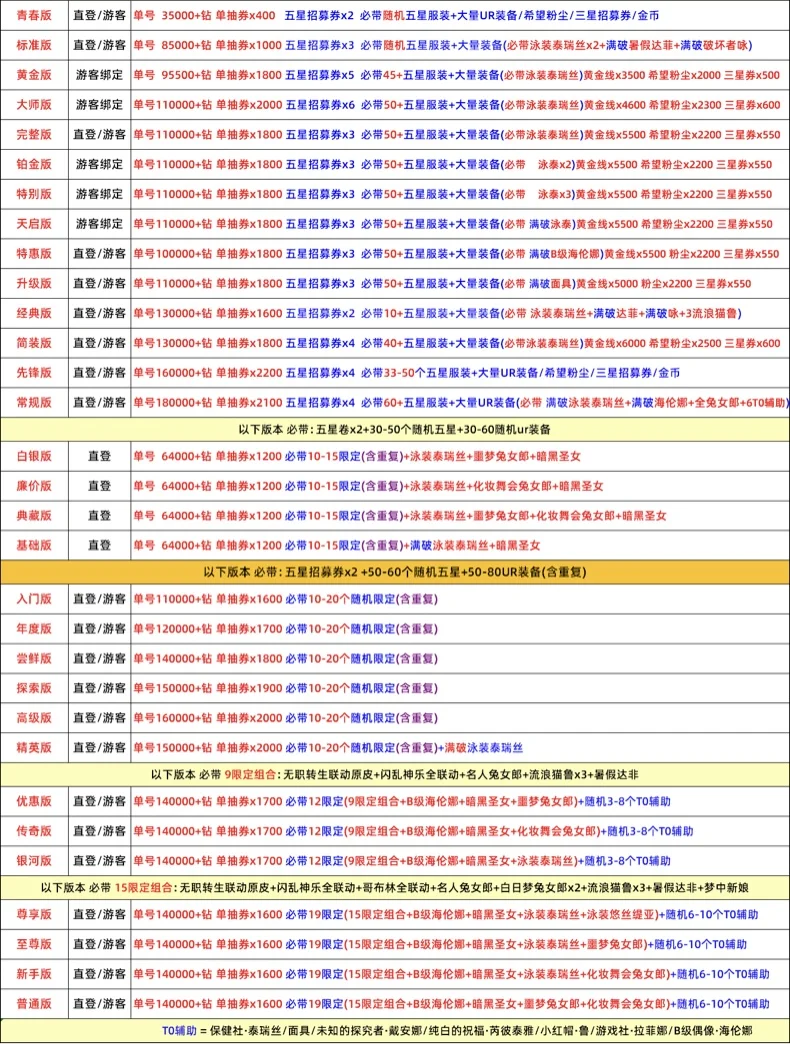 以下版本 必带:五星招募券x2 +40-60个随机五星+80-100UR装备+B级海伦娜 | ||