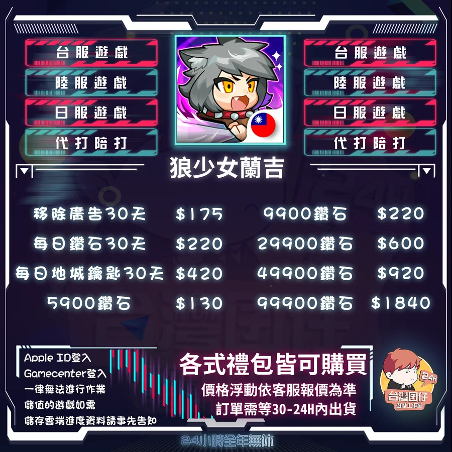 6️台灣囝仔台陸手遊代儲純粹為協助代儲服務,僅收取服務費,無賺取額外差價。