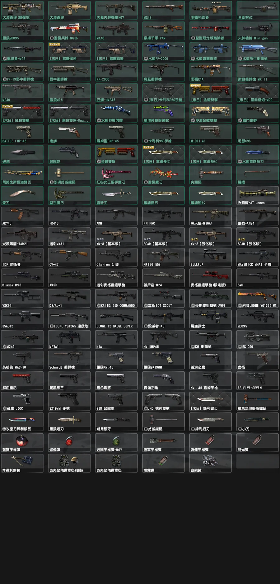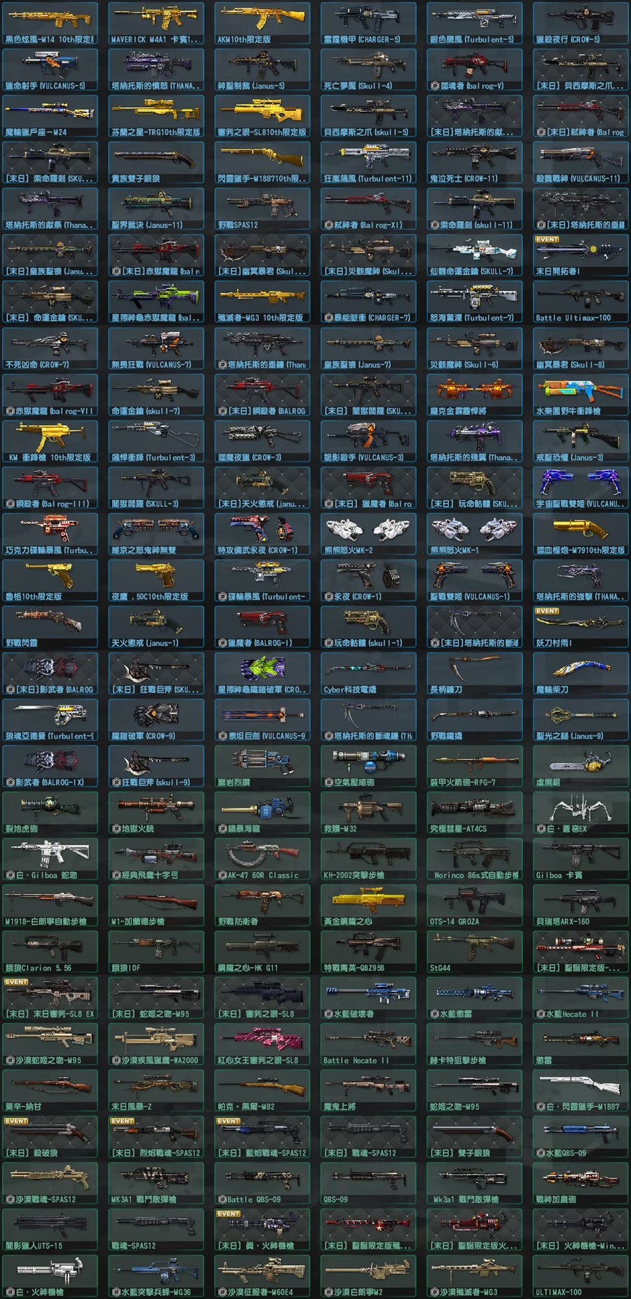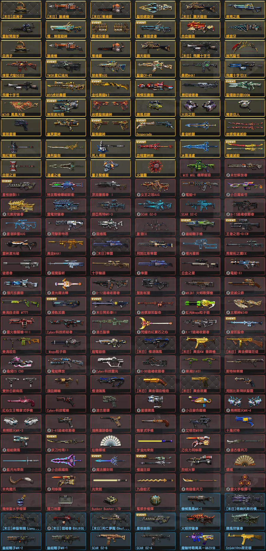 新增: [末日]黑暗騎士M4A1、[末日]神聖騎士AK-47、水墨戰將、仙鶴戰鬥鬼蟒、邪靈碎石I、邪靈碎石II、[末日]泰坦巨劍、[末日]聖光之鎚、[末日]空氣壓縮砲、[末日]戒聖恐懼、[末日]獵命射手、[末日]聖界裁決