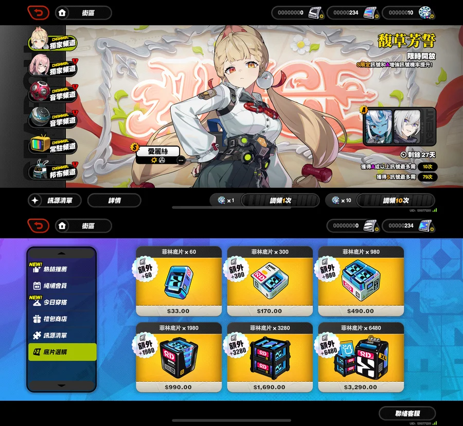 女主,目前角色池小保墊10抽;武器池未墊抽,帳號內有10加密+234菲林=約11抽