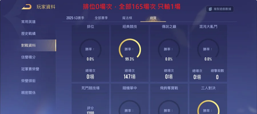 30等 165場 總勝率99.4% ( 只輸一場 )