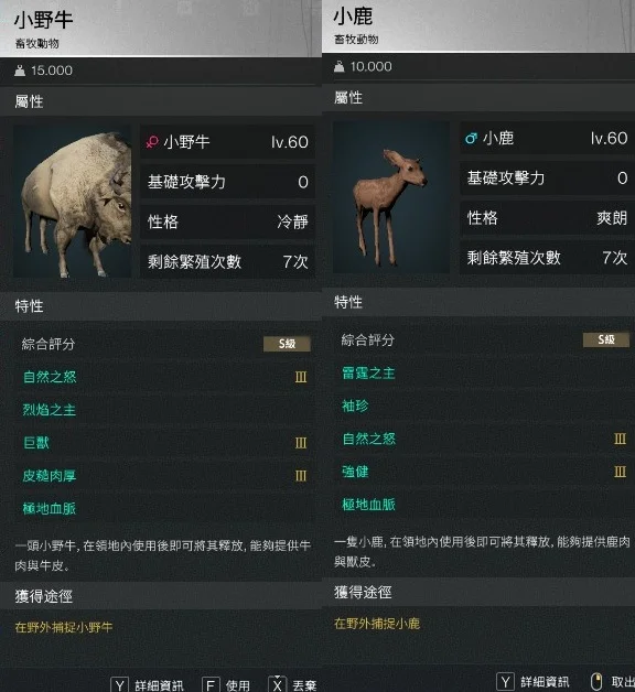改版後繁殖機制的新一代宰殺動物,培養較為困難需花費大量時間與精力,一對詞條一樣的 S 級動物,繁殖之後詞條 100% 一樣。