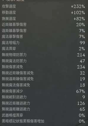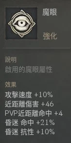重點數值-攻速+5% 近傷+96、近命+111、力量 +32、物防+154、傷害減免59、PVP近命35、PVP近傷57、無視PVP物理防禦10、無視傷害減免48、無視近迴23、近迴15
