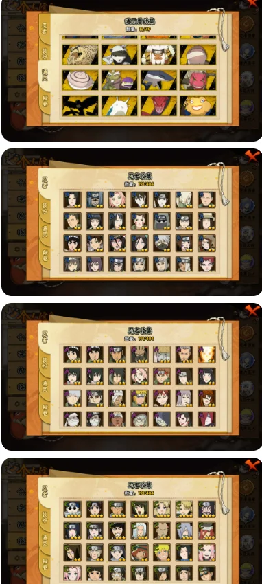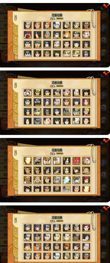 【S 級忍者】:千手柱間「穢土轉生」(3 星),宇智波鼬「穢土轉生」(3 星),宇智波斑「穢土轉生・解」(3 星),大野木「忍界大戰」(3 星),宇智波帶土「忍界大戰」(3 星),艾「忍界大戰」(3 星),宇智波鼬「須佐能乎」(3 星),宇智波止水「須佐能乎」(3 星),旗木卡卡西「須佐能乎」(3 星),千手柱間「木葉創立」(3 星),自來也「舞之豪傑」(3 星),大蛇丸 (3 星),自來也「傳說中的三忍」(3 星),波風水門 (3 星),藥師兜「仙人模式」(3 星),漩渦鳴人「九喇嘛連結」(3 星),邁特凱「死門」(3 星),佩恩「天道」(3 星),大筒木桃式 (3 星),大筒木舍人「最終章」(3 星)