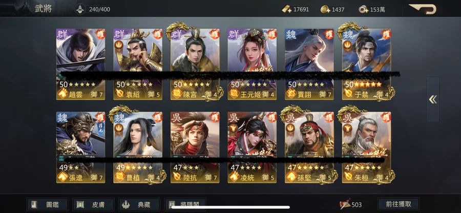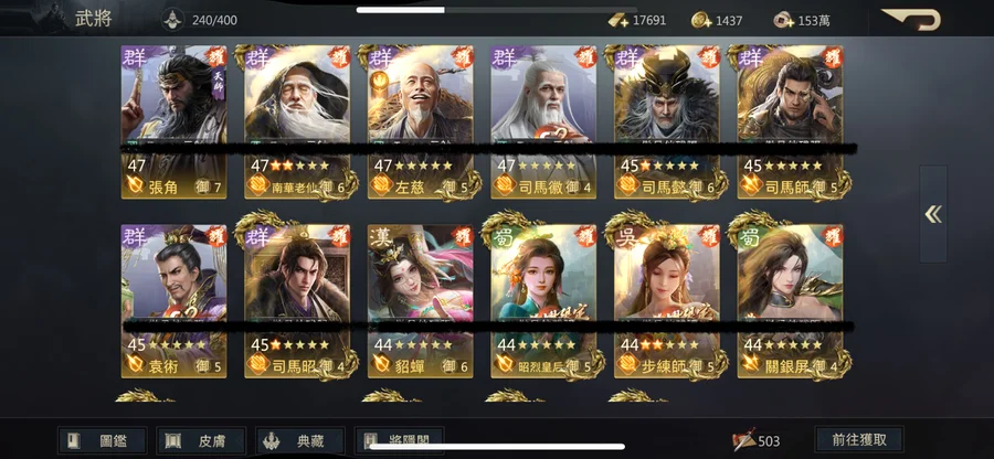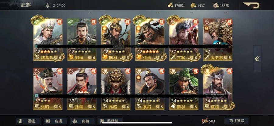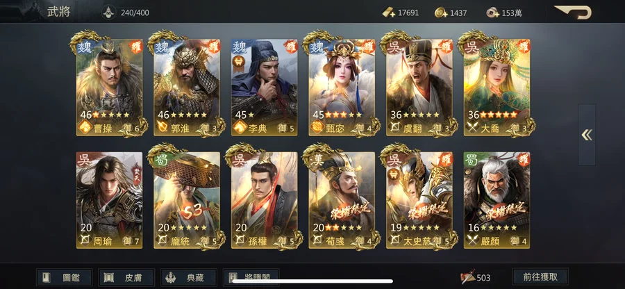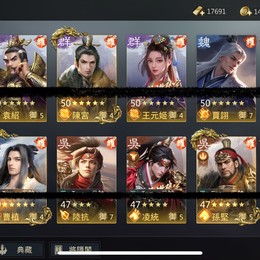 7御:群趙滿星、魏賈詡滿星、魏張遼2星、吳陸抗3星、群張角無星