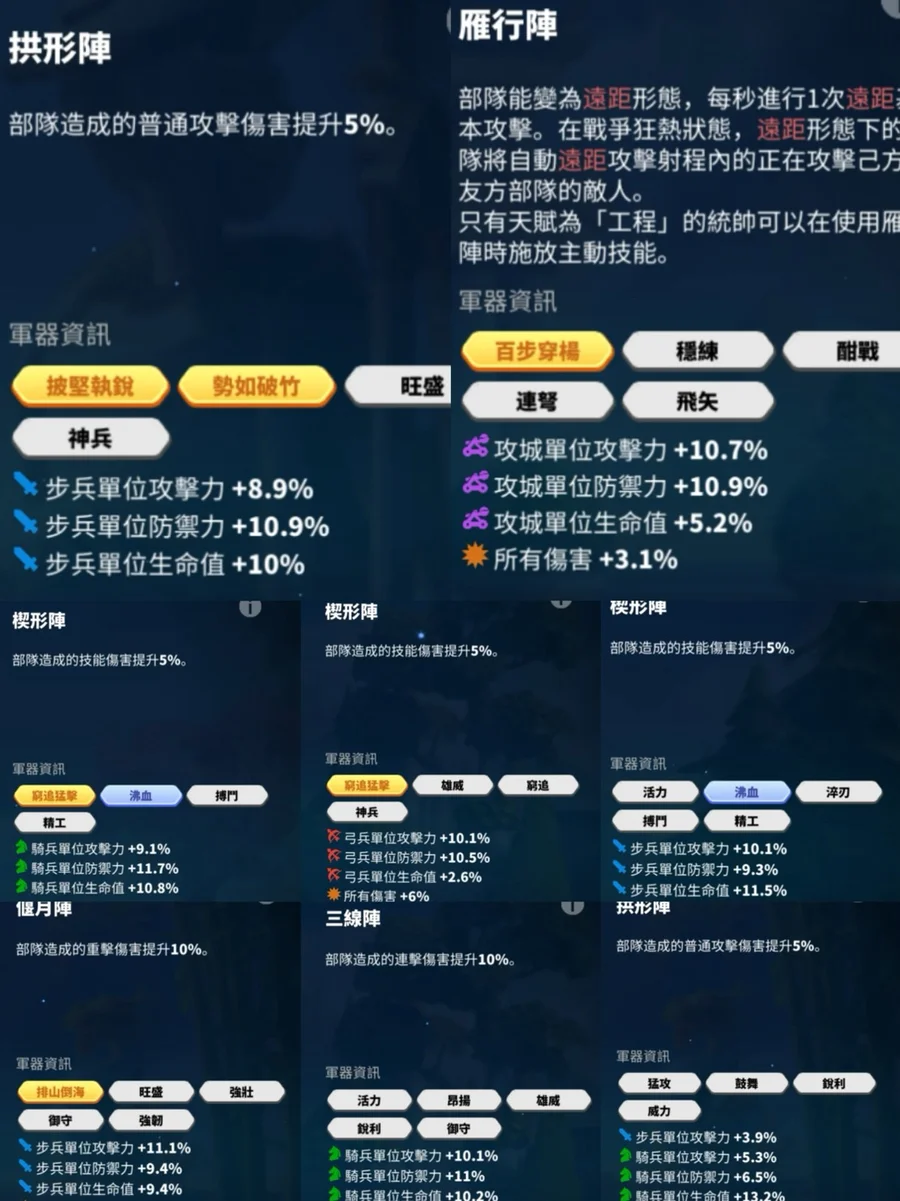 遠程一套(4字/白8字),騎兵三線一套(白10字),步兵偃月一套(4字/白8字)