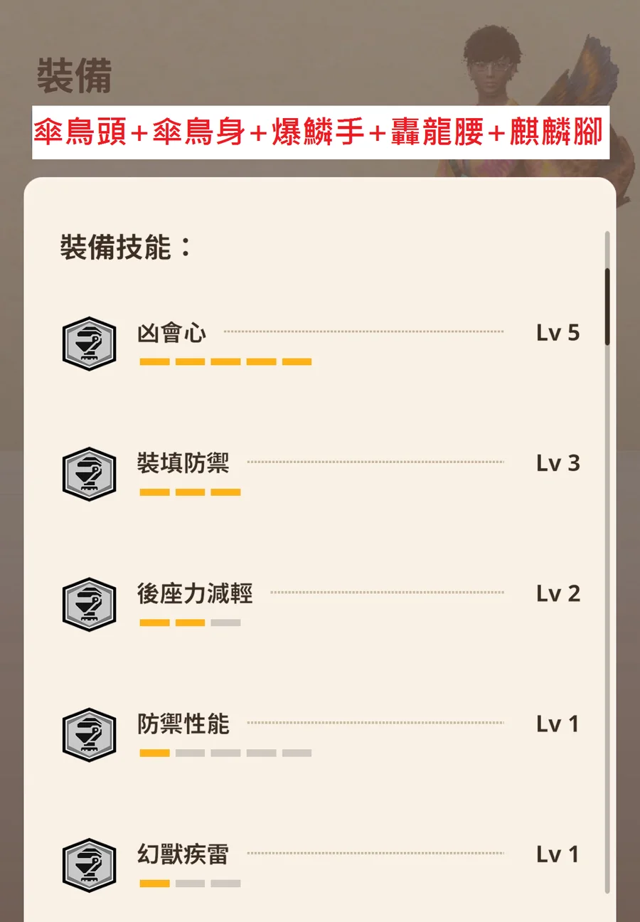 裝備素材已預留可配裝: 傘鳥頭+傘鳥身+爆鱗手+轟龍腰+麒麟腳