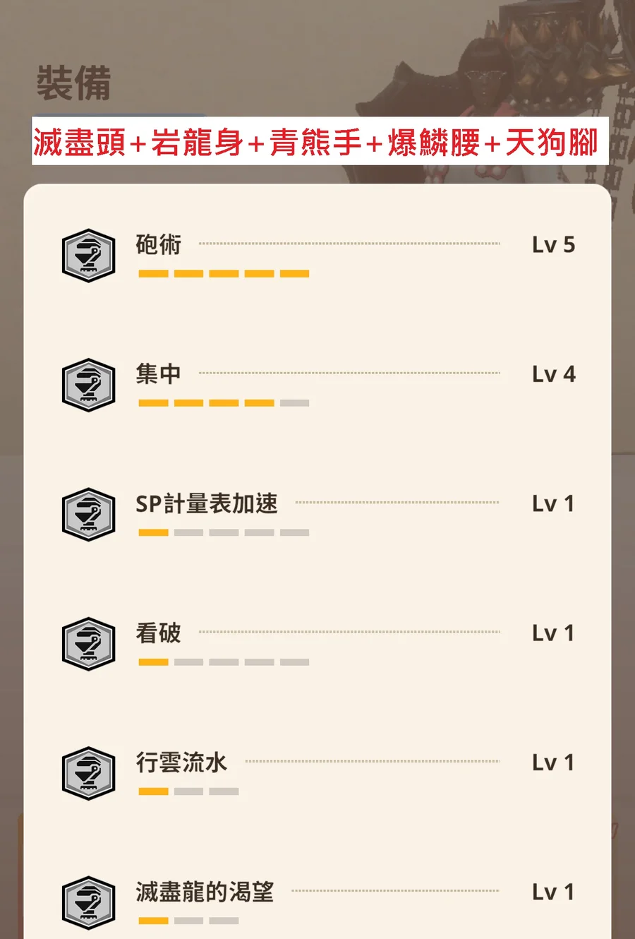 目前裝備(如圖):滅盡龍頭+岩龍身+青熊手+爆鱗腰+天狗腳