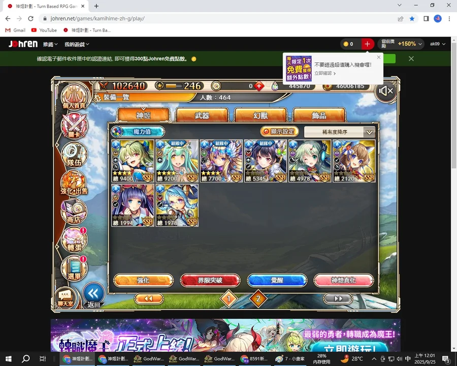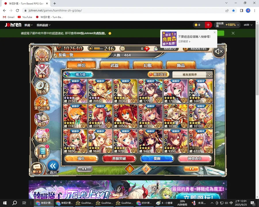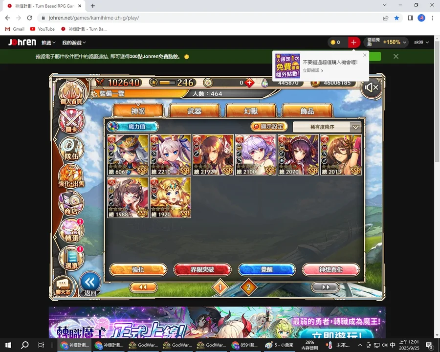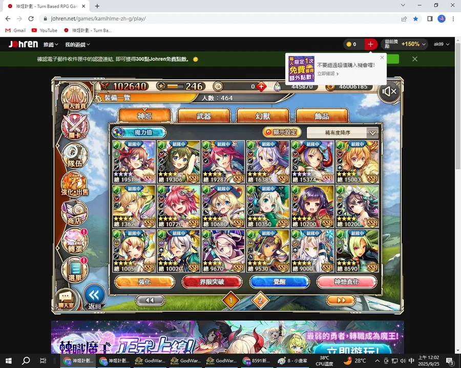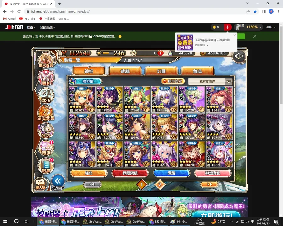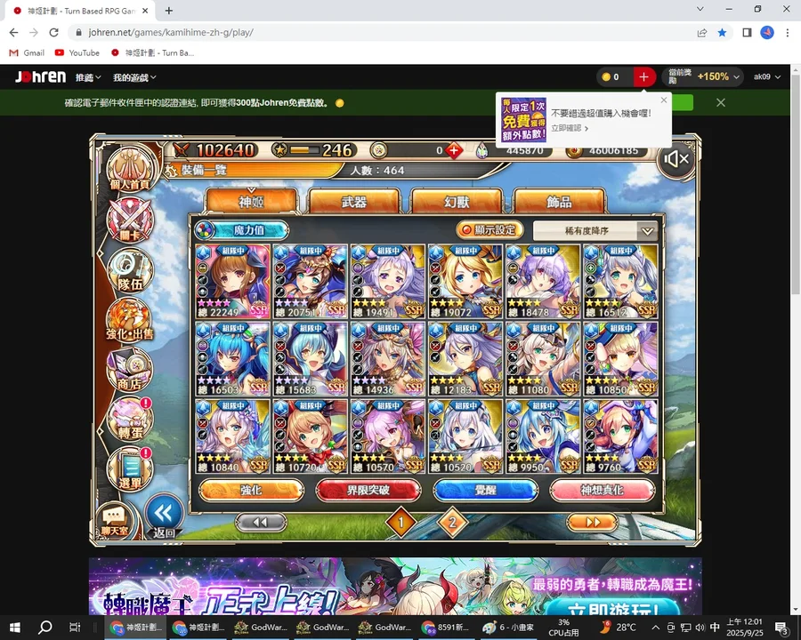 繁中6獄 各屬戰力10萬 魔水晶44萬 149SSR神姬機獸材料破千最後剩2帳號