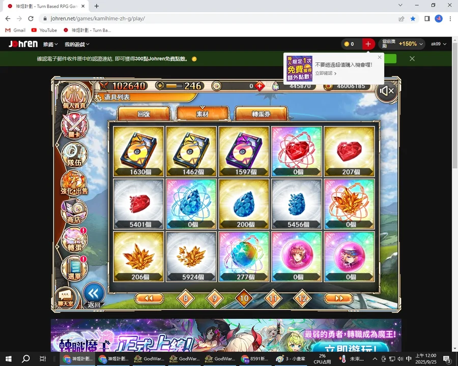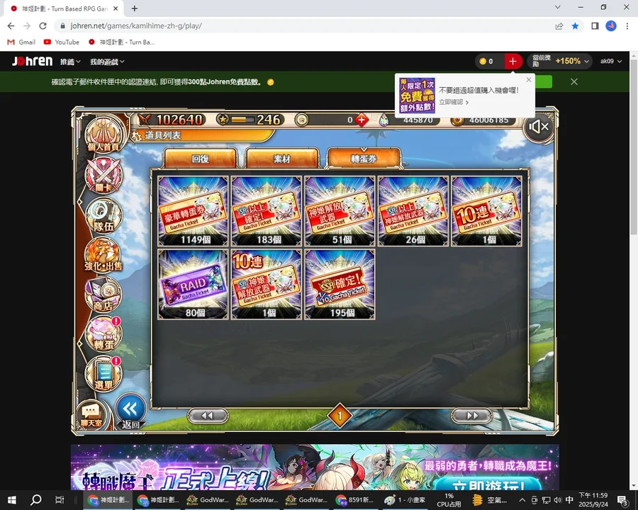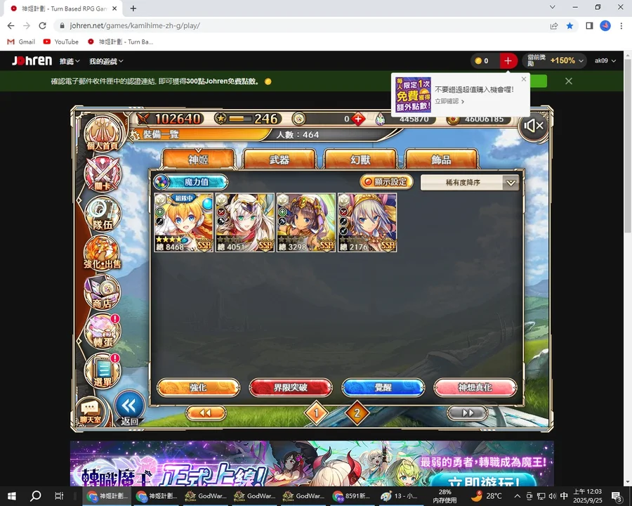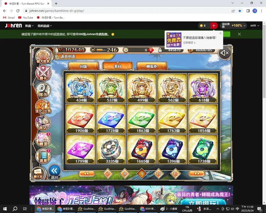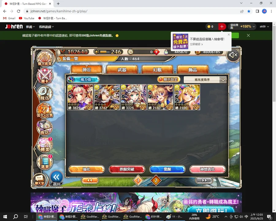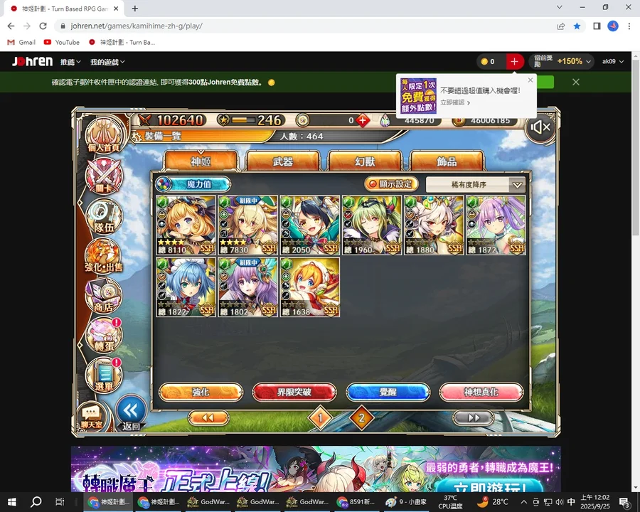 繁中6獄 各屬戰力10萬 魔水晶44萬 149SSR神姬機獸材料破千最後剩2帳號