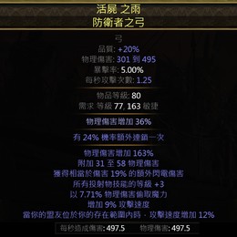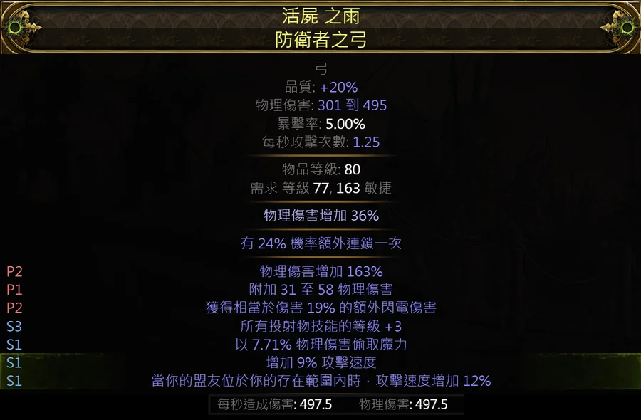 大傷495 額外閃電傷/投射物技能+3/攻擊速度/物理偷取魔力/連鎖/