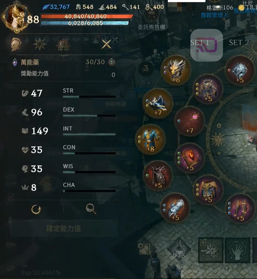 【商城裝備】:+8燦爛賢者T、+6奧拉面、+7火龍面、+7燦爛知識肩甲