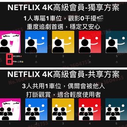 ✨ Netflix 4K 高級方案 🔹【獨享方案】(1車位自己1個人/看賣場圖片) | 方案 | 價格 |