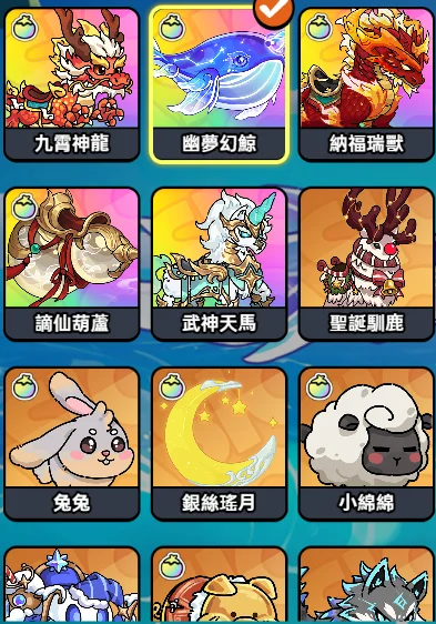 坐騎: 藍鯨 瑞獸 天馬 葫蘆 神龍 黑月亮 雪橇 馴鹿