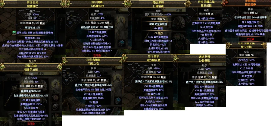 鞋子跟手套也做卓越底+插槽100%+法器也+2瓦2洞 頭也瓦兩洞+兩顆保留還有褻瀆保留 項鍊也是特別做的高ES日耀沒廢詞暴擊傷害 基本上裝備都全頂了 衣服也瓦三洞了
