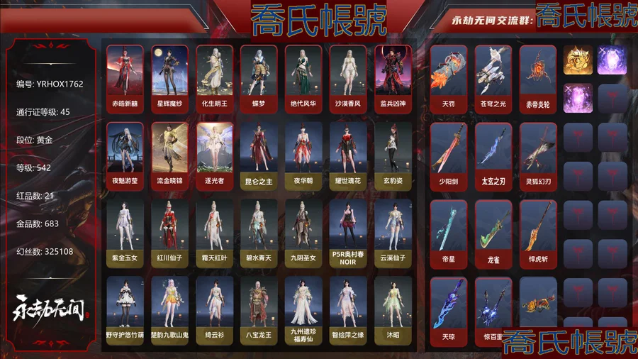 【YJYRHOX176211】21紅683金|等級542|黃金|幻絲325108|金磚1850|通行證Lv.45 紅色神品:赤皓新囍,星輝魔紗,化生明王,蝶夢,絕代風華,沙漠香風,監兵凶神,夜魅遊瑩,流金曉錦,逐光者,天罰,蒼穹之光,赤帝炎輪,少陽劍,太玄之刃,靈狐幻刃,帝星,龍雀,悍虎斬,天瓊,驚百里 角色金色皮膚:崑崙之主,夜華朝,耀世魂花,玄豹姿,紫金玉女,紅川仙子,霜天紅葉,碧水青天,九陰聖女,P5R·奧村春NOIR,云溪仙子,綠野守護·悠竹萌客,楚韻九歌·山鬼,綺雲衫,八寶龍王,九州遺珍·福壽仙,智繪·萍之緣,沐昭,春雪,新倩女幽魂·瑤光沐月,護世四法·多聞天王,鬥羅大陸·唐三,噬月天狼,長歌詩韻·鷓鴣天,巫師3·傑洛特,巨闕,觀山海·夏神祝融,龍心熾焰,遊四海,洛天依·星空投影,巔峰極速·小可,鬥羅大陸·小舞,長歌詩韻·遣唐使,山吹茶,輝燁少女,承雲蘭壽,春桃笑,御宅羅夢,清雅少女,貴胄少女,狩獵都市·暗夜利刃,千秋匠心·青枝瓷,流火映真,陰陽師·赤影妖刀姬,妖刀姬,汐淚,綠野守護·暗沼摩羅,觀山海·精衛,阿娜希塔,楚韻九歌·湘夫人,觀山海·文鰩,巨鯨客,倒反陰陽·鐵面,2674·爭鬥洪流,複製體·尼爾,西行劫·楊戩,弘毅袍,華夏寶甲·漢光,封神錄·申公豹,司天命,幽篁山鬼,朝聞道,祿運玉霄,紫微星命,封神錄·龍吉公主,藏雨閣主,赤丹朱湛,禍津素盞,麟鹿大鎧,倒反陰陽·凜冬,巔峰極速·蕾雅,拳皇·不知火舞,千秋匠心·玉葉景,觀山海·青鳥,神鷹之女,龍門·飛天,浣煙紗,福瑞天澤,葫蘆兄弟·蛤蟆頭領,街頭狂歡·不敗擂主,觀山海·秋神蓐收,西行劫·悟空,行空裘,斑斕衣,冬無歸,熾火照夜,夏日派對·盛夏白陽,干將莫邪,觀山海·冬神玄冥,春不斂,封神錄·妲己,日影花陰,黃昏巫主,夜綢袍,長歌詩韻·念奴嬌,金財聚輝,封神錄·姜子牙,雲間影,綠野守護·山漠獰影,天虹詠,開闢鴻蒙·日月明,雪鈴綺歌,虹貓藍兔七俠傳·藍兔,長歌詩韻·如夢令,狩獵都市·雷行獵手 髮型金色皮膚:(挑染)泠川發,簪纓發,天南發,韶光發,綠野守護·嬌憨發,百靈發,P5R·NOIR髮型發,紫芙發,逆水寒·江海發,巫師3·白狼發,月丹發,鬥羅大陸·雀變發,月下香發,(挑染)櫻舞發,碎浪發,安瀾發,鯨海發,綠野守護·冷傲發,倒反陰陽·銘誓發,竹律發,(挑染)清威發,封神錄·紅鸞星發,排霜發,翔鸞發,夕鷹發,觀山海·青鸞發,千秋匠心·琳琅發,拳皇·女忍發,(挑染)戾君發,觀山海·天刑發,(挑染)宵燭發,觀山海·冥泉發,流螢發,繾綣發,幽焰發,鶴髮,古溪發,封神錄·籠煙芍藥發,驚雀發,秀逸發,(挑染)獅鬃發,長歌詩韻·豪傑發,封神錄·仙風發,(挑染)風吹雪發,蜜語發,長歌詩韻·沉醉發,(挑染)雷霆客發,狩獵都市·迅猛發 武器金色皮膚:驚火弦,御氣弩,穿雲燕,天牛翼,千機弩,鎮海,雨歇,狂嘯,朱雀,沉默審判,戲祥雲,綠野守護·雨幕,引冰落,金蠍,玉飛梭,螢火,石中火,雪國禮炮,兔華籠,雷落,鑽山,觀山海·嘉果花,墨雙戟-不歸,火羅衛,竹霹靂,龍息,龍嘯,丹鶴,凝冰魄,赤霞,虎踞,爐中火,心魔,月虹弦角,烏木弓,豹胎易筋弓,轉輪弓,風馳弓,青花,春水,蓮心劍雨,炎魔,不良人·華陽針,玄銅飛軍,翠影,綠野守護·毛乎乎,天狐,虹貓藍兔七俠傳·冰魄劍,巫師3·湖女之劍,亢龍,隱鋒,監星尺,複製體·月光與黑暗,俠骨·清光引,劫燼·煉,赤霄,燭神令,醉花風,殘陽,金玉一文字,劫燼·燎,數珠丸,倒反陰陽·盡春鋒,雷厲,白鹿,燭淚,斬銀河,青石猊,破天,赤雲之刃,龍蟠,山君怒,雷王鋸,錦鯉化龍·烙刃,聽濤,暮影,星輝環月,千鈞羽,斷月影,麒麟牙,鎮山河,靈木角,鬥羅大陸·海神三叉戟,觀山海·金神鉞,劫垢·堀,焦鈺,長虹,雪夜·清光引,建木,白虹,寶月琉璃,糖果棍,冰輝,護世四法·降魔,武道無窮·封魔,學宮之杖,倒馬棍,2674·貳型電漿杖,戒律杖,判官筆,曼提柯爾之牙,橈尺刀,三更令,仙舞,華夏神兵·馬首刀,青峰疊扇,拳皇·舞扇,騰雲歌,耀夜流華,千堆雪,逍遙,夔牛槌,月瞳,嘶風,法持,鎮魔杵,九霄寒,精武,空寒,古墓麗影·登山鎬,怨憎,武道無窮·雙蝶,無救,天威,禍忌,天之刑,絕潮汐,破重雲,曜金紫珀,觀山海·水衡 飾品金色皮膚:真的抱歉,白菜頭,自動人形·埃米爾,甜蜜心動,玄陶俑面·女,雁落笠,豹耳,暖冬帽·女,美團·團上頭了,植物大戰殭屍2·腦子給我,粽香遠,西行劫·蛛絲墜,P5R·NOIR的帽子,綠野守護·絨絨貓,夏日派對·兔兔髮箍,系雲瀾,觀山海·腓耳,觀山海·腓尾,炎流雲禪笠,玄陶俑面·男,暖冬帽·男,甜夜安眠·絨熊奶泡,魔燭帽,靈蘭,天狼盔,燼焚之尊,巫師3·驢耳朵,甲辰龍,瑞獅頭,福虎帽,立烏帽,靈狐耳,暗香,安歌帽,鮫人角,雪鹿雌角,倒反陰陽·鑑心冠,銀雪,兔耳,虎絨耳,葫蘆兄弟·蛤蟆頭,街頭狂歡·制勝之道,觀山海·秋金,西行劫·緊箍兒,臥龍·呂布鐵面,觀山海·冬稜,纖蝶絨輕,封神錄·傾城,醉狐銀,夢棠,玄天冠,虹貓藍兔七俠傳·虹光,玉蓮冠,金瑛冠,夜露帽,盜墓筆記·防風帽,鹿鈴角,神愈之冕,虹貓藍兔七俠傳·寒月,狩獵都市·碎空龍尾,驟雷鏢旗 變身器:荊魂 【代幣或期限道具請以實際驗號為準】【Steam】【國服】自玩賬號,PVE畢業