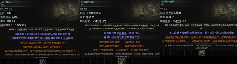 【輔助寶石】族裔→艾許的光芒(閃電混沌)卡洛翰的決心(暴擊)特卡蒂的憤怒(盛怒中毒)