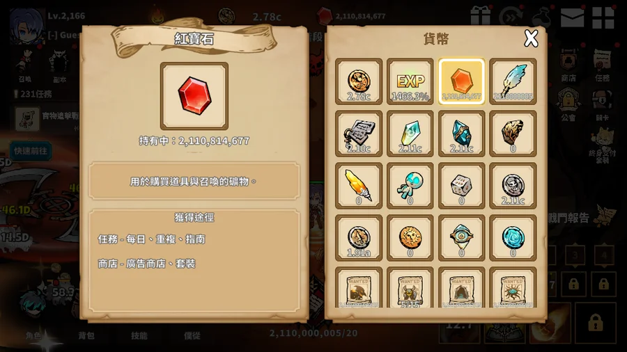 21億金幣 + 21億鑽 + 21億討伐積分 + 21億記錄之筆 + 21億魔法水晶 + 21億深淵碎片 + 21億狩獵證章 =