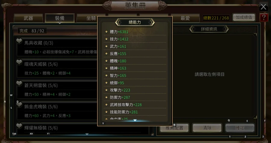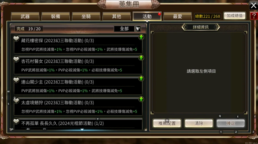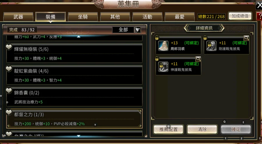 收集冊221/267 周郎披風已衝好,差征戰披風兌換,4樣活動裝都有還在努力中