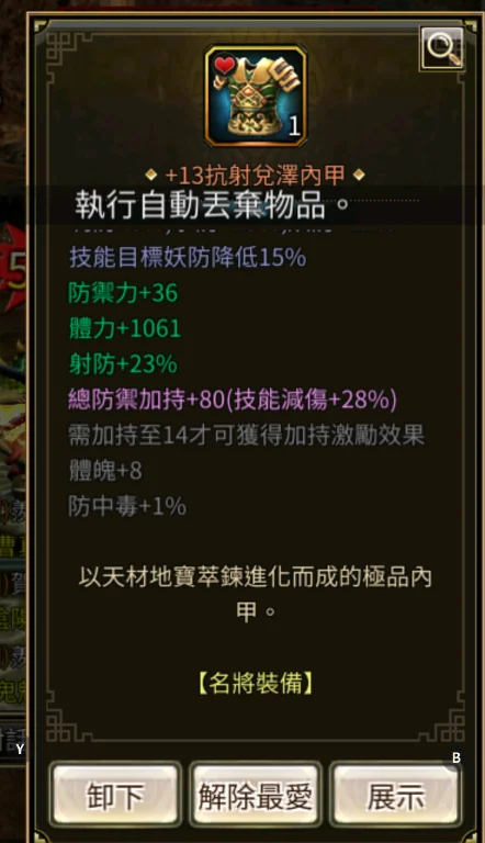 +14士兵防具 防火10%碎9%水9%射6%妖5% (未綁)