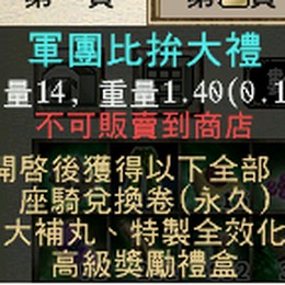 (座騎兌換卷(永久)、百變大補丸、特製全效化功丸、高級獎勵禮盒)