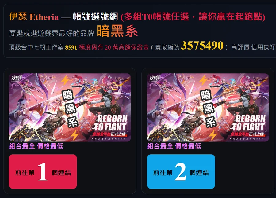 ❌ 這些不碰 - 不用外掛、不跑腳本、不洗分 - 不動你的道具、倉庫、聊天紀錄(真的需要用,會先跟你講清楚) 🔐 我們怎麼做 - 真人打手手動代打,必要時用浮動 IP/付費 VPN/專線,風險降到最低 - 全程有進度回報,關鍵節點會貼截圖給你看 - 你可以指定時段;急件幫你插隊排程 📝 下單小提醒 - 在留言板留:伺服器/角色ID或好友碼/想做什麼/希望時段 → 我們才能快排 - 中途想調整也行:我們會同步更新影響範圍、交期、費用,你點頭才會跑 - 未開工可取消;進行中就照已做的里程結算,彼此公平 - 完成當天請驗收;有問題直接貼截圖找我們處理 💳 交易與信任 - ⚡暗黑系⚡=8591 極度稀有「20 萬保證金」賣家,高評價、信用好 - 支援 8591 安全交易;價格會跟市場走,以當下客服報價為準 - 要發票OK,留言板留姓名/信箱;不索取我們直接代捐 📞 聯絡與下單 - 伊瑟 的代練/跟車/陪玩/熱門品項/帳號/等級/裝備/道具/遊戲幣,⚡暗黑系⚡一站式幫你搞定 - 你丟需求,我來排班;快、穩、好溝通 ⚠ 風險聲明 - 依各遊戲公司服務條款,現款交易屬禁止行為 - 因相關交易遭官方警示/凍結/封停等處分之風險與損失,悉由您自行承擔;本方不負賠償或補償責任 - 我們將盡力提供申訴、資料整理與進度追蹤協助,但不保證恢復結果,最終以官方判定為準